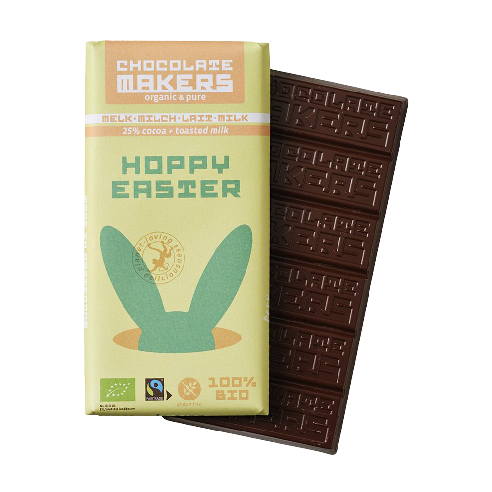 Duurzame chocolade van Chocolate Makers met een vrolijk paasdesign. Een bewuste en lekkere traktatie, ideaal als origineel paasgeschenk.