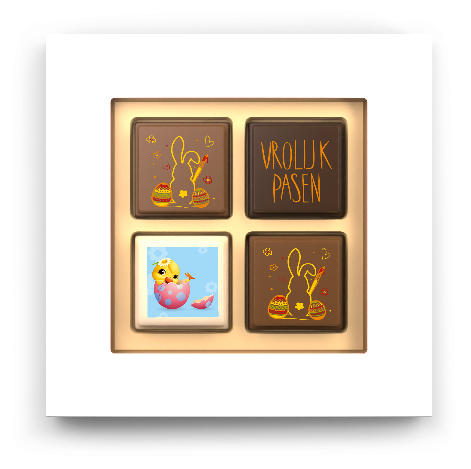 Fijne bonbons van hoogwaardige chocolade in een stijlvolle verpakking. Een elegant en smaakvol relatiegeschenk voor Pasen of het voorjaar.